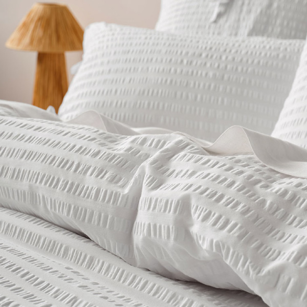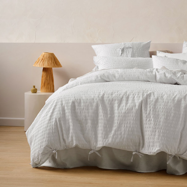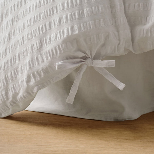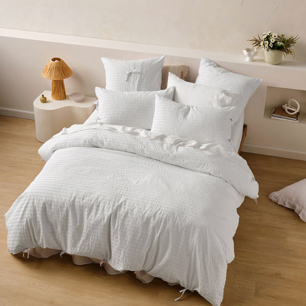 Finished with classic tie enclosures on its duvet cover and pillowcases, this yarn-dyed belle in timeless white looks even more inviting adorned with coordinating scatters, creating a textural paradise.