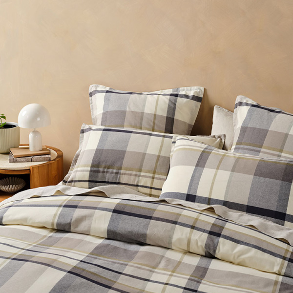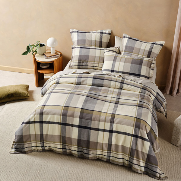 A lively spin on the classic check, Lennon’s yarn-dyed brushed cotton will add splendid texture to your bedroom, with its neutral yet warming palette of vanilla, seagrass and stone with highlights of khaki, indigo and charcoal. Complete with its plain-dyed reverse and elegant tailored trims, this set invites all those luxe winter sleep-ins.